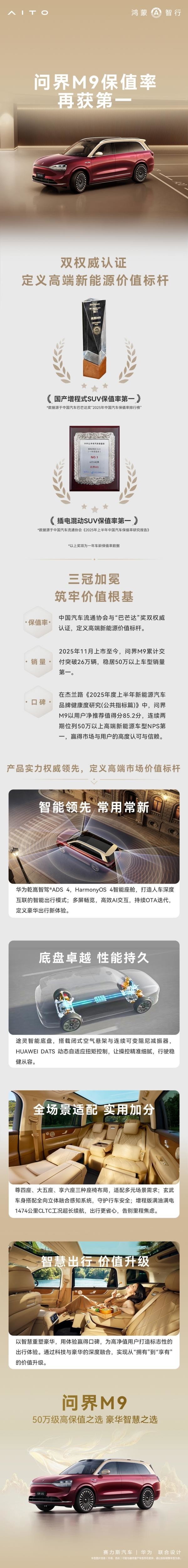 【CNMO科技消息】12月30日,问界汽车官方发布消息称,其旗舰车型问界M9在保值率方面再度获得权威认可,被授予“国产增程式SUV保值率第一”及“插电混动SUV保值率第一”两项认证。该成绩基于中国汽车流通协会发布的《2025年中国汽车保值率研究报告》以及“中国汽车巴菲特奖”评选结果,标志着问界M9在高端新能源市场中持续巩固其价值领先地位。