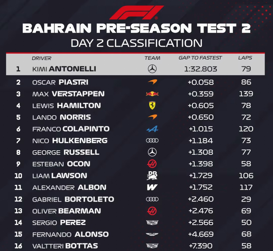 安东内利和皮亚斯特里在本次测试中首次跑进1分32秒以内,安东内利在萨基尔赛道创造了2026赛季赛车迄今为止的最快单圈。迈凯伦和梅赛德斯的里程数非常可观,分别跑了158圈和156圈,而维斯塔潘以137圈位居车手榜首。